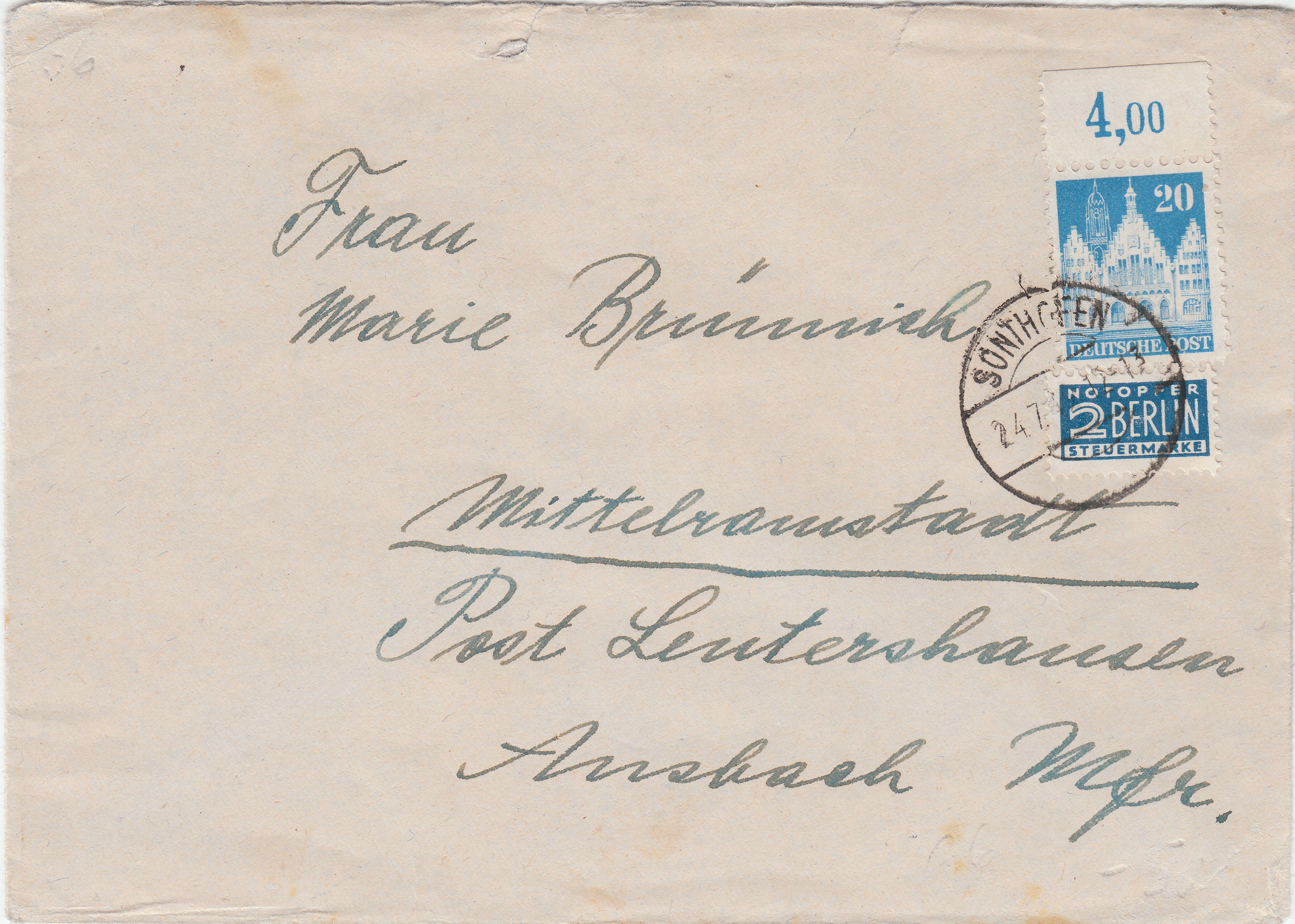 Der Oberrand Typ Bagel wurde bei diesem Exemplar abgetrennt und dazu verwendet, die Notopfermarke zu befestigen, die ohne Gummierung ist. Ich tippe daher relativ eindeutig auf eine Wiederverwendung einer bereits gebrauchten Zwangszuschlagsmarke zum Schaden der Post.