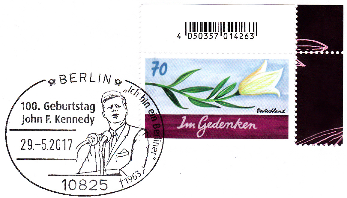Am 29.5.1964 erschien eine Sondermarke zu 5 Cent mit einem Porträt von Kennedy und einer ewigen Flamme im Bild.
