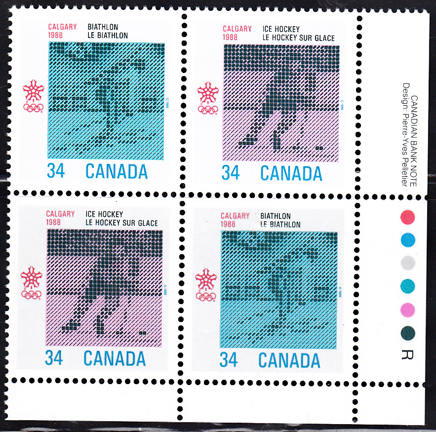 Auf dieser Marke aus Kanada (MiNr 1012) zu den Olympischen Spielen in Calgary 1988 ist bei genauer Betrachtung ein Eishockeyspieler zu erkennen.
