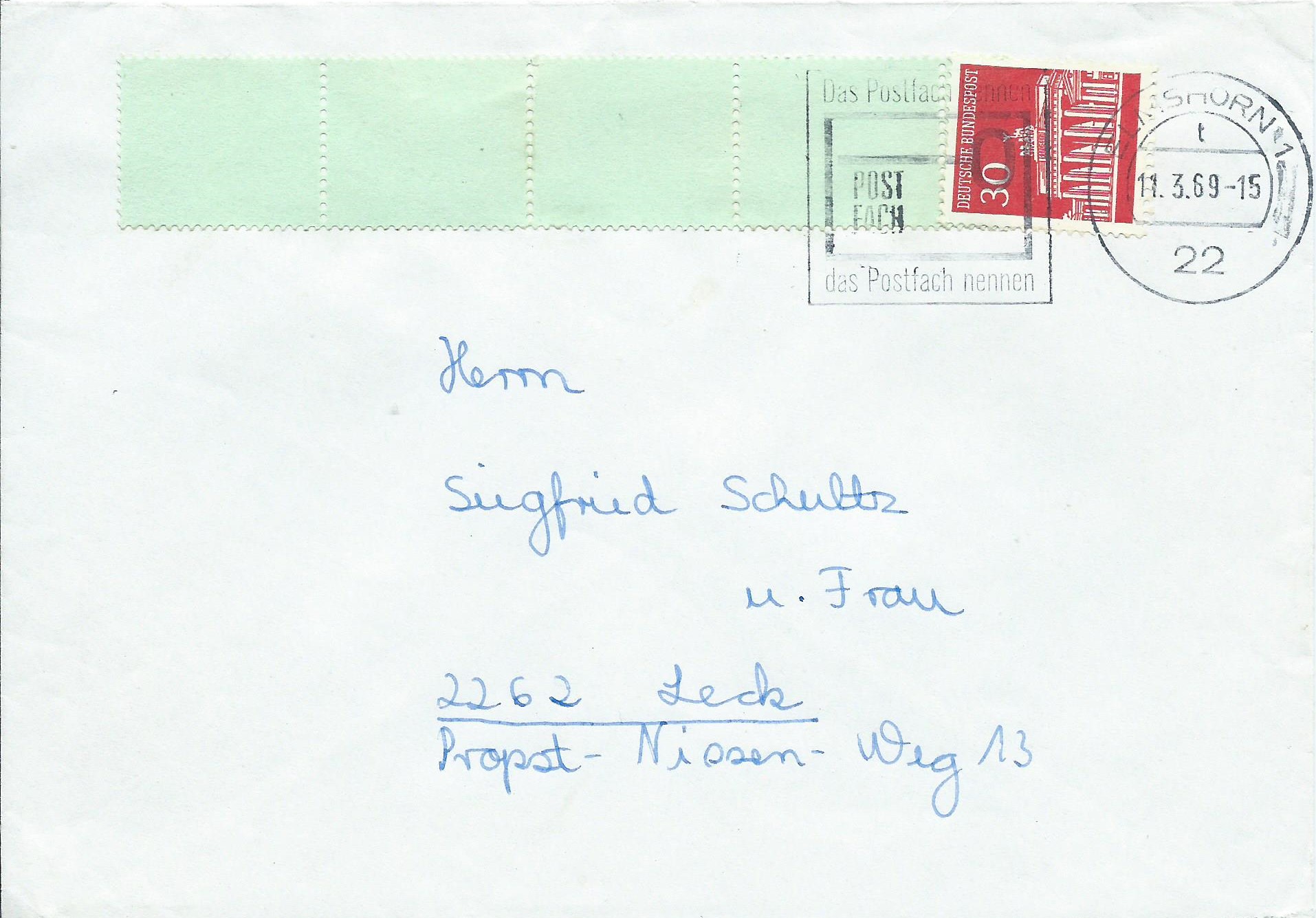 Und der letzte Beleg mit einer Einzelfrankatur Rollenende 1 + 4 stammt ebenfalls aus Elmshorn, gestempelt am 11.3.69.