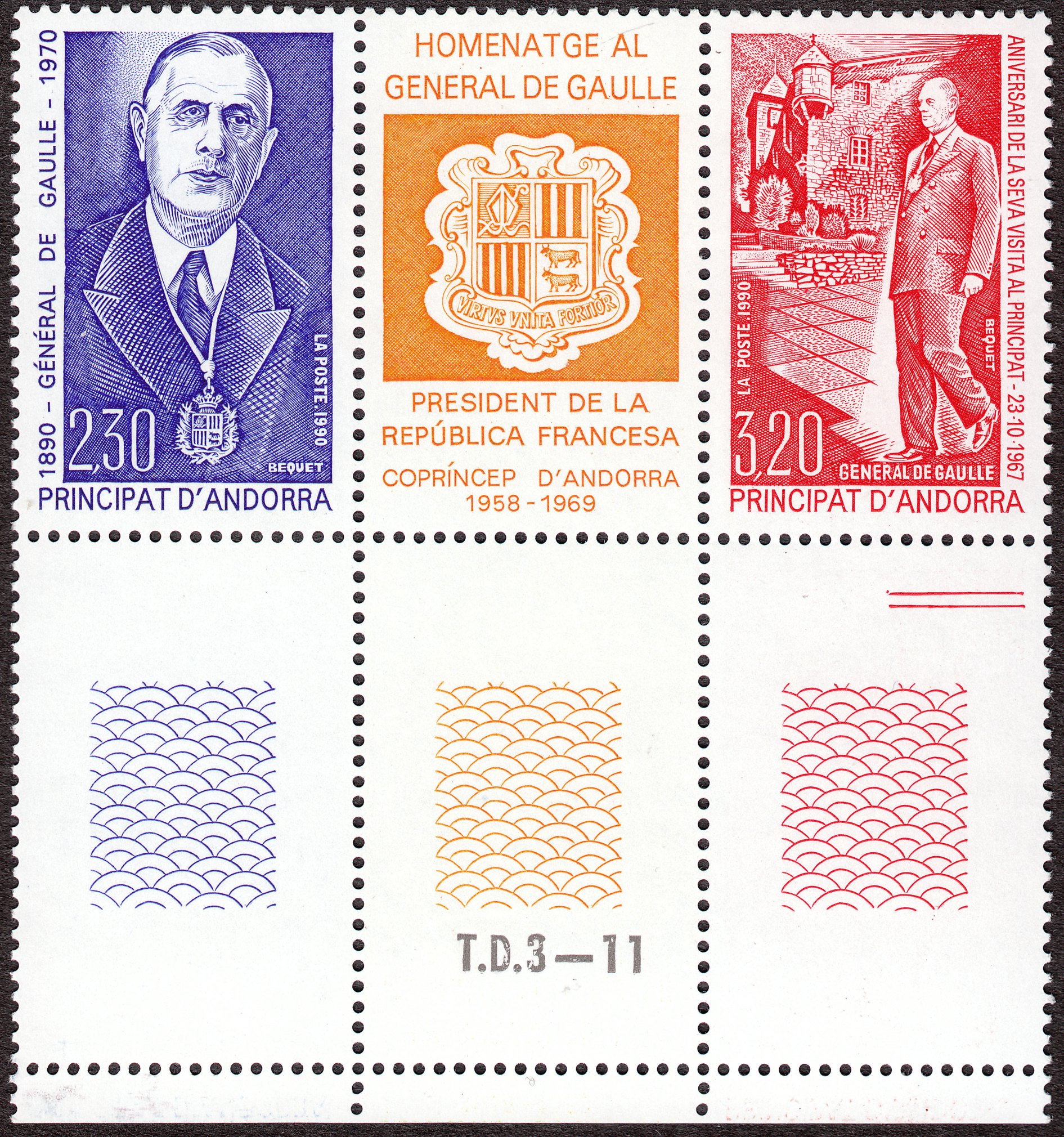 Hier ein ihm zu Ehren erschienener Zusammendruck aus Andorra vom Unterrand mit Leerfeldern in Markengröße: