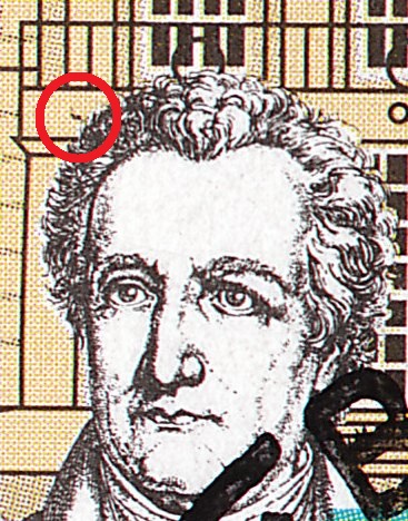 Schaut man sich die einzelnen Marken genauer an dann findet man auf Feld 2, also bei der zweiten Marke von links in der oberen Reihe, den Plattenfehler MiNr. 2028 X, "Locke" links an Goethes Kopf unter dem Geländer:
