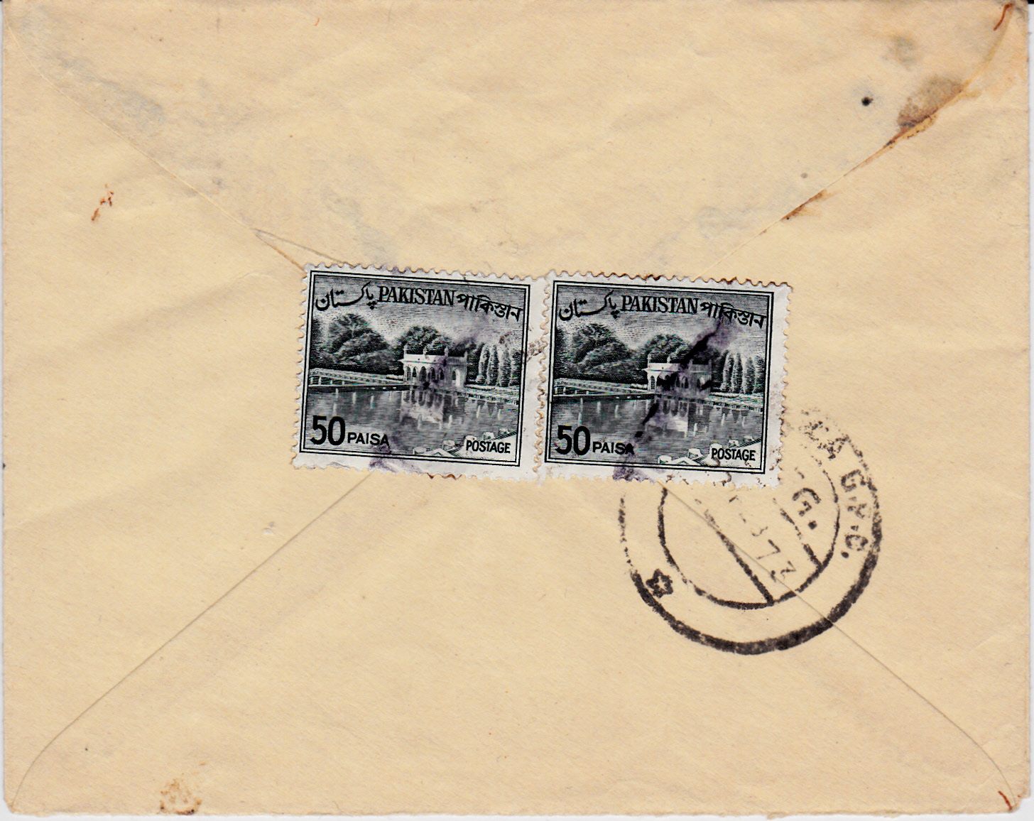 Der erste Inlandsumschlag Bangladeschs mit dem Werteindruck zu 20 Paisa in Braun mit dem Motiv Wasserlilie wurde hier per Einschreiben aus dem Distrikt Rangpur nach Dacca am 20.2.1973 verschickt. Porto für die Zusatzleistung Einschreiben wurde auf der Rückseite verklebt (100 Paisa).