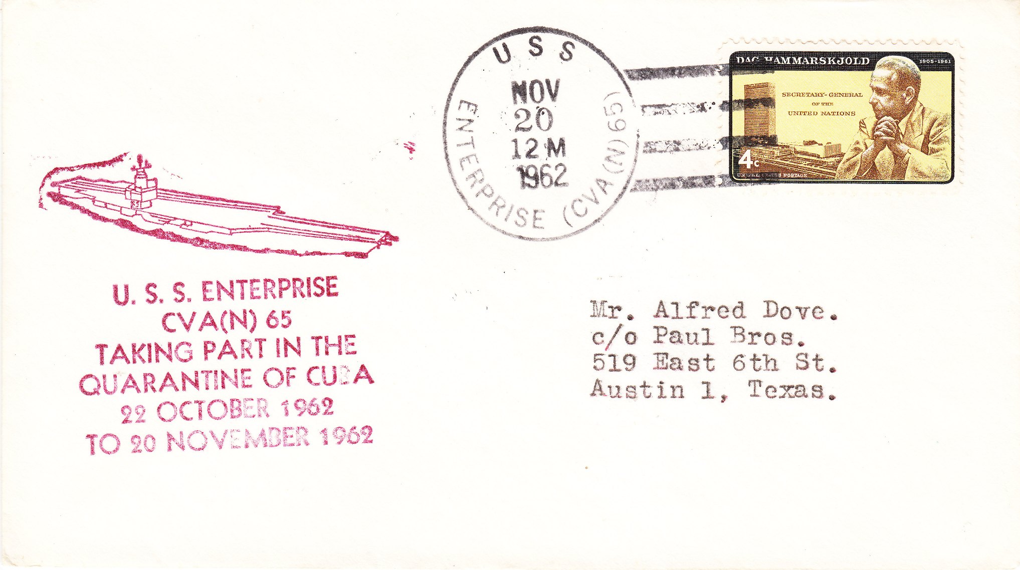 Hier ein weiterer Beleg mit dem Cachetstempel zur Seeblockade Kuba = TAKING PART IN THE QUARANTINE OF CUBA: