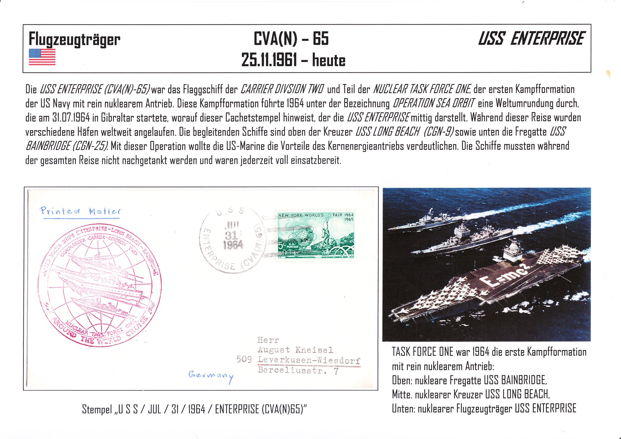 Die USS ENTERPRISE war Teil der "Nuclear Task Force One", der ersten Kampfformation der US Navy mit rein nuklearem Antrieb. Hier ein Beleg von der Weltumrundung, die am 31.07.1964 in Gibraltar startete: