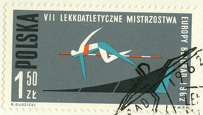 Schersprung als Sprungstil benutzte. Dieser Stil war im Ausgabejahr 1963 (MiNr. 787) an deutschen Schulen sicher die bevorzugte Sprungstilart. neben dem sich später durchsetzenden "Straddle", dem "Bauchwälzer".