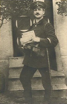 Das Motiv auf der Marke wurde nach diesem Foto vom Mai 1927 des Fotografen "Kober" gestaltet, das den Landzusteller Matthias Palz in Dienstkleidung auf dem Zustellgang in Köwerich/Saargebiet zeigt: