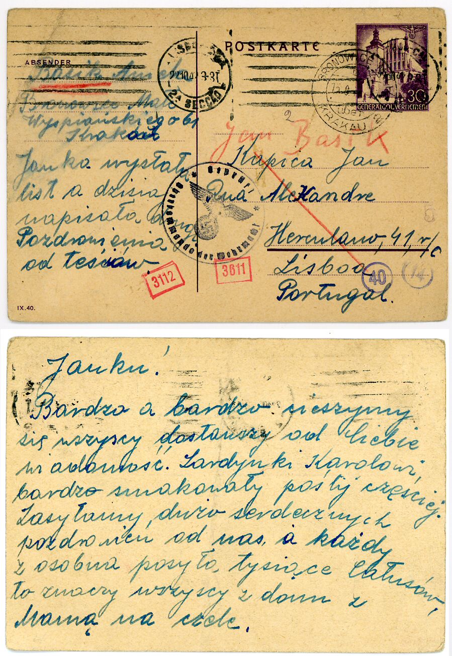 Diese Postkarte war adressiert an "Barecki Jósef" in der "R. (= Rua) Alexandre Herculano 41 LISBOA Portugal", was eine Deckadresse in Lissabon für die "Polish Offices" in London war.