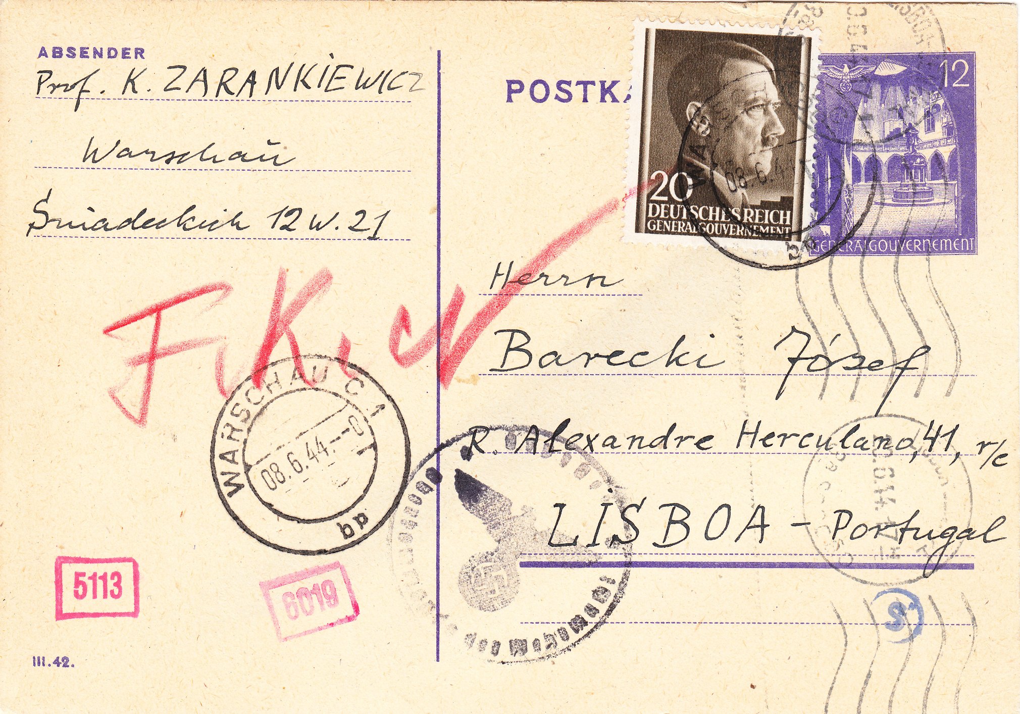 Der prominente Absender dieses Beleges war "Prof. K. Zarankiewicz" = "Professor Kazimierz Zarankiewicz", der sich bei Einlieferung dieser Sendung ins Ausland am Postschalter auswies, was durch den Blankoabschlag des Tagesstempels "WARSCHAU C 1 bp" am "08.6.44" um "0"(?) Uhr dokumentiert wurde.