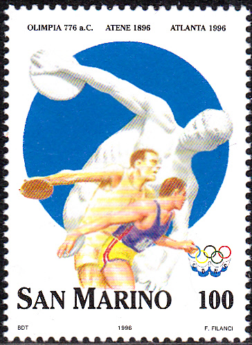 In der Serie "100 Jahre Olympische Spiele der Neuzeit" aus San Marino vom 12.2.1996 erschien auch diese Marke (MiNr 1640) mit der Abbildung eines antiken Diskuswerfers (die berühmte Statue des "Discobolus" des antiken Bildhauers Myron (um 450 v.Chr.)) eines Sportlers aus der Zeit um 1896 und eines modernen Sportlers von 1996.
