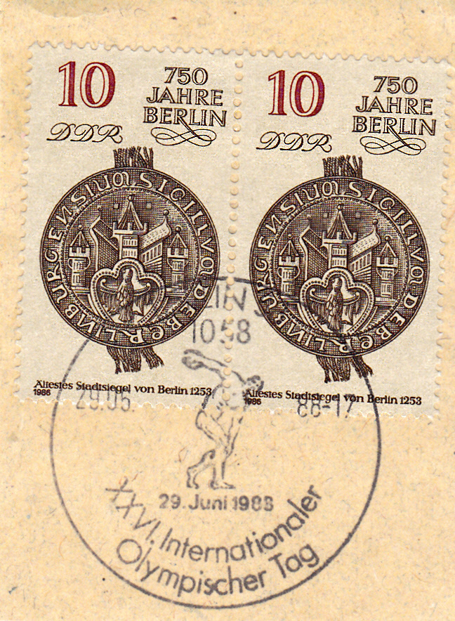 Sonderstempel vom 29.6.1988 aus Berlin zum XXVI. Internationalen Olympischen Tag mit einer Abbildung des antiken Diskuswerfers nach der berühmten Statue des "Discobolus" des antiken Bildhauers Myron (um 450 v.Chr.)).