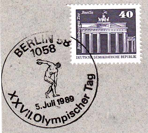Auch der Sonderstempel vom 5.7.1989 aus Berlin zum XXVII. Olympischen Tag zeigt eine Abbildung des antiken Diskuswerfers nach der berühmten Statue des "Discobolus" des antiken Bildhauers Myron (um 450 v.Chr.)).