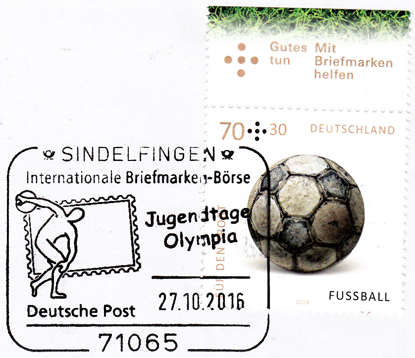 Im Sonderstempel vom 27.10.2016 zu den Jugendtagen "Olympia" bei der Briefmarkenbörse in Sindelfingen ist auch die Statue des "Discobolus" zu bewundern.