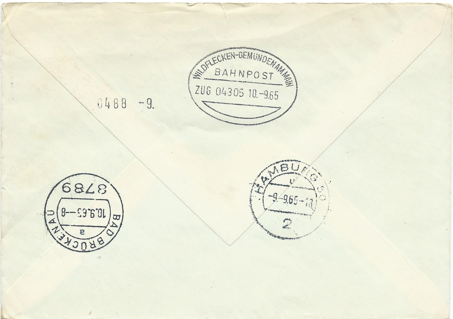 auf einem schon etwas zurückliegenden Streifzug durch Wühlkisten an einem Tauschtag sind mir 2 Belege in die Hände gefallen, welche ich nicht liegen lassen konnte. Der erste ist ein Eilbrief aus Husum nach Bad Brückenau, gestempelt am 9.9.65. Auf der Briefrückseite finden wir die üblichen Durchgangsstempel der Stationen, die der Beleg durchlaufen hat. Interessant ist da vor allem der Bahnpoststempel. Mich selber hat allerdings mehr das Oberrandstück der 90-Pf-Marke Bedeutende Deutsche interessiert. Gerade die höheren Pfennig-Werte der Serie mit Oberrand sind schwer zu erhalten, da nimmt man auch gerne mal einen Beleg, um den Reihenwertzähler zu dokumentieren.