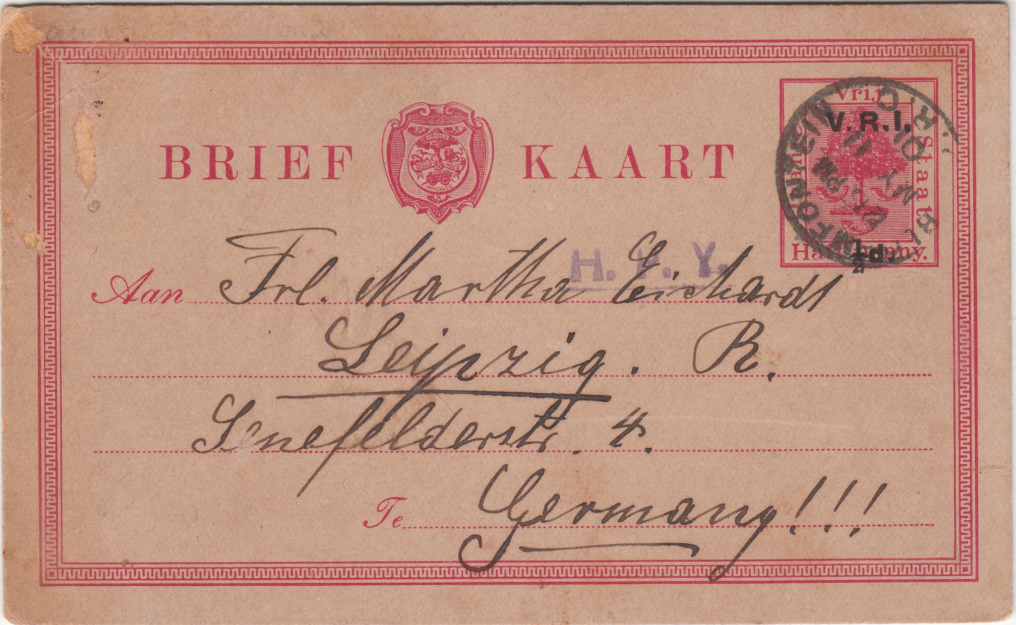 Während des Burenkriegs gab es von November 1900 bis März 1902 in Orten des britisch besetzten Oranjefreistaates als Zensurstempel Einzeiler, die die Initialen des Zensors angeben. Die meisten solcher Stempel stammen von Bloemfontein, so auch dieses Beispiel "H.P.Y" auf einer Ganzsache vom 11.05.1901 nach Leipzig: