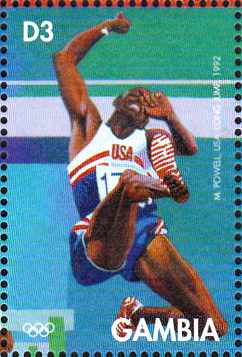 Auf der Marke aus Gambia (MiNr 2419) zu den Olympischen Spiele 12996 ist Mike Powell beim Weitsprung zu sehen. Er hält seit 1991 bis heute mit 8,95m den Weltrekord im Weitsprung der Männer.