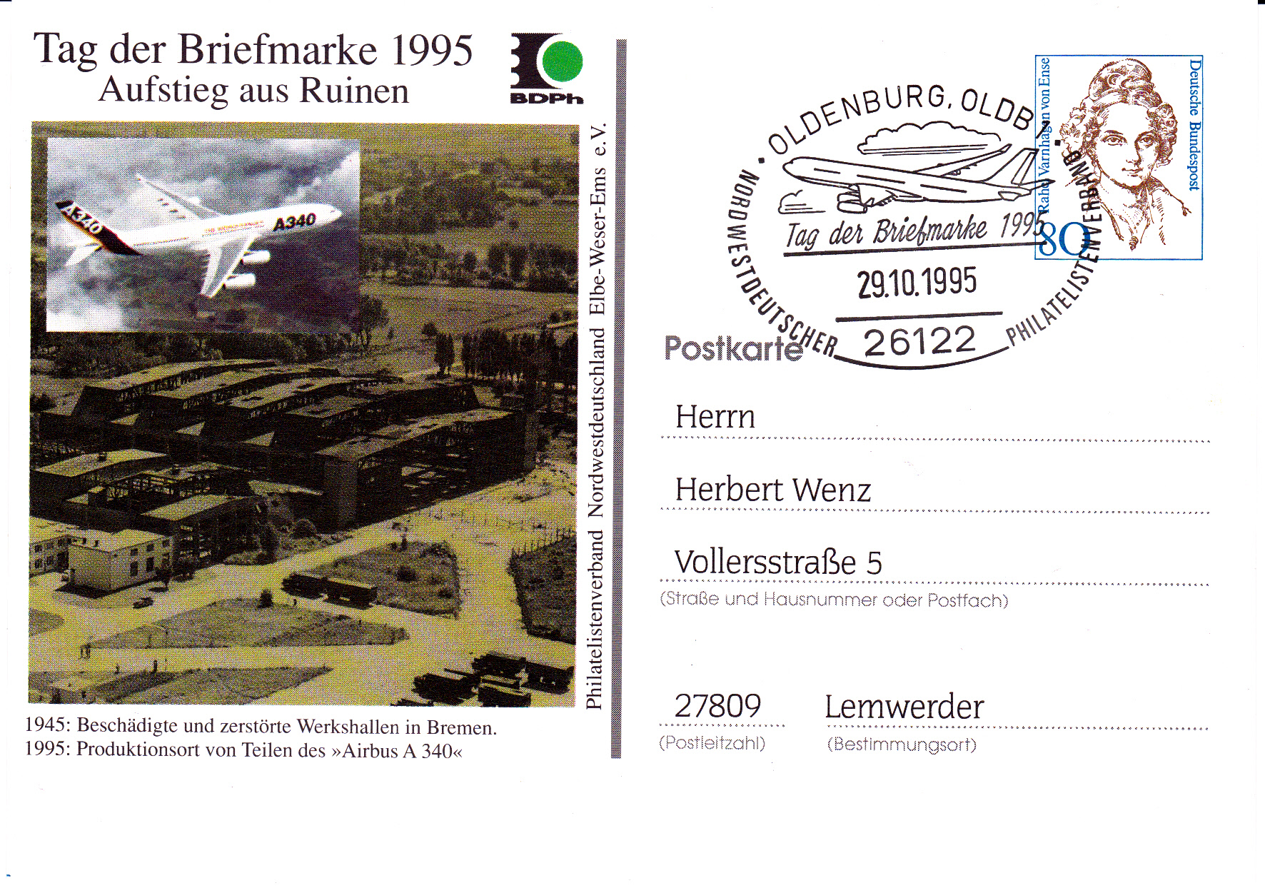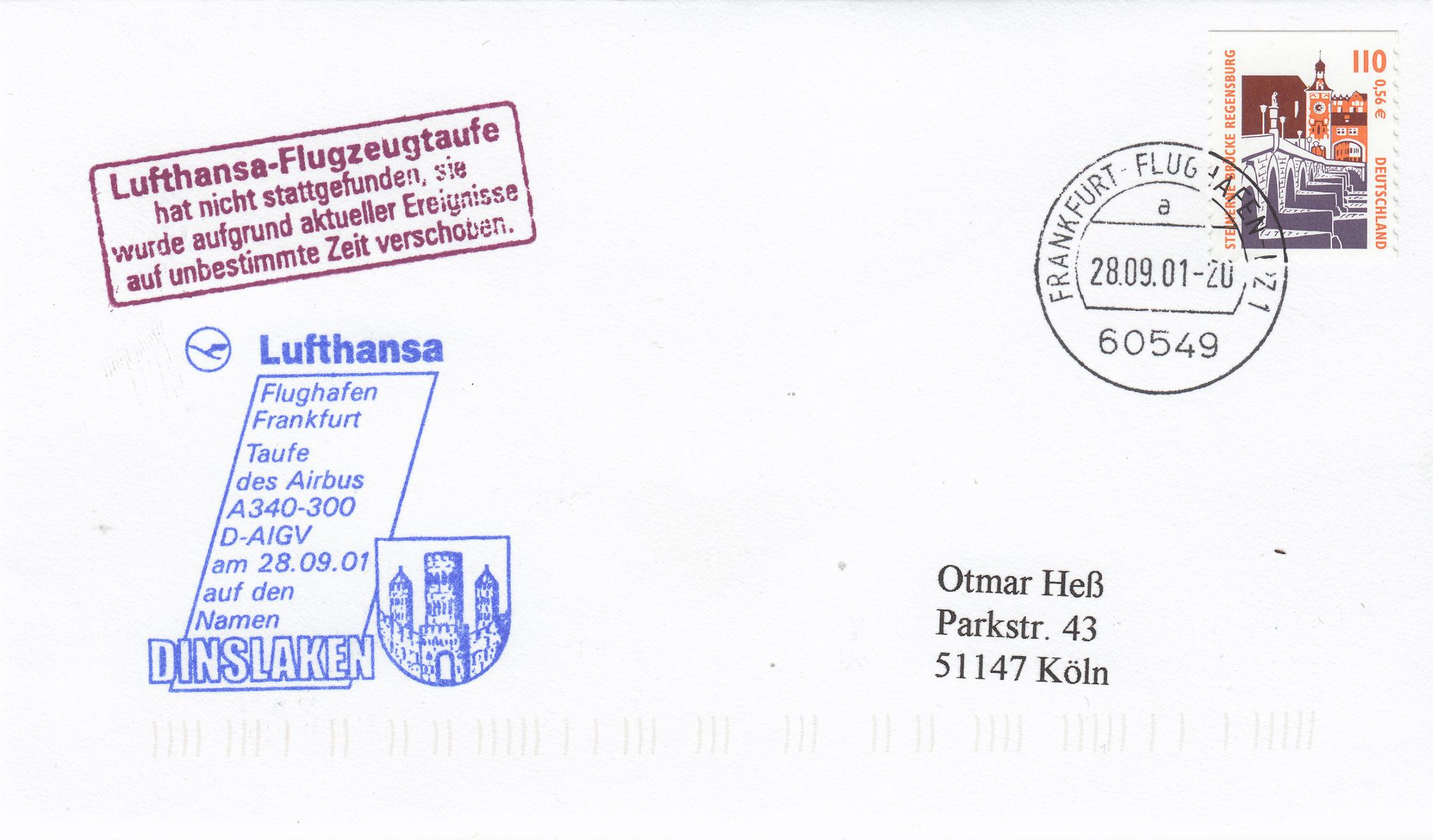 Am 28.09.2001 war die Taufe des Airbus A340-300 mit der Kennung "D-AIGV" auf den Namen "DINSLAKEN" geplant, was durch diesen Beleg dokumentiert werden sollte: