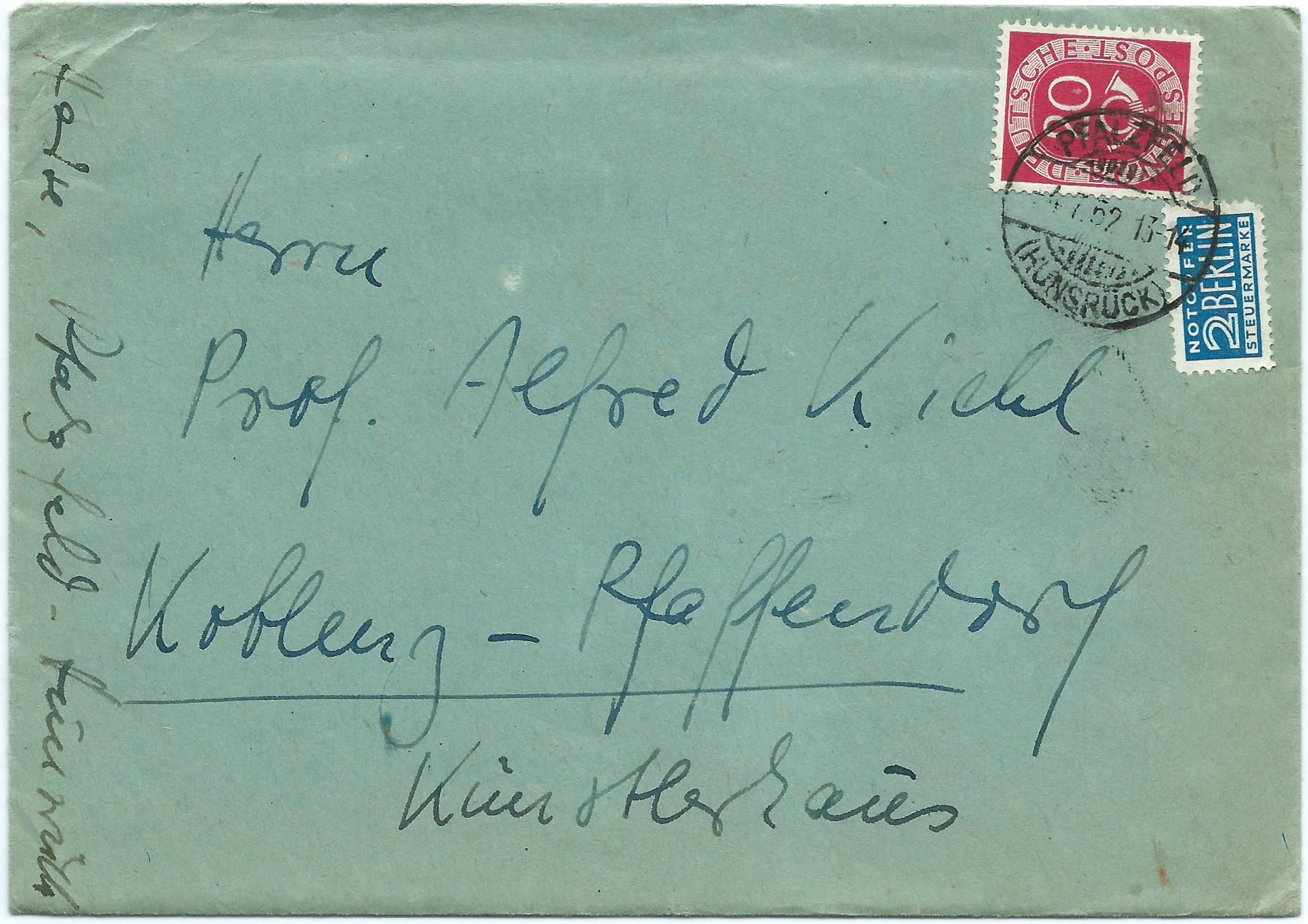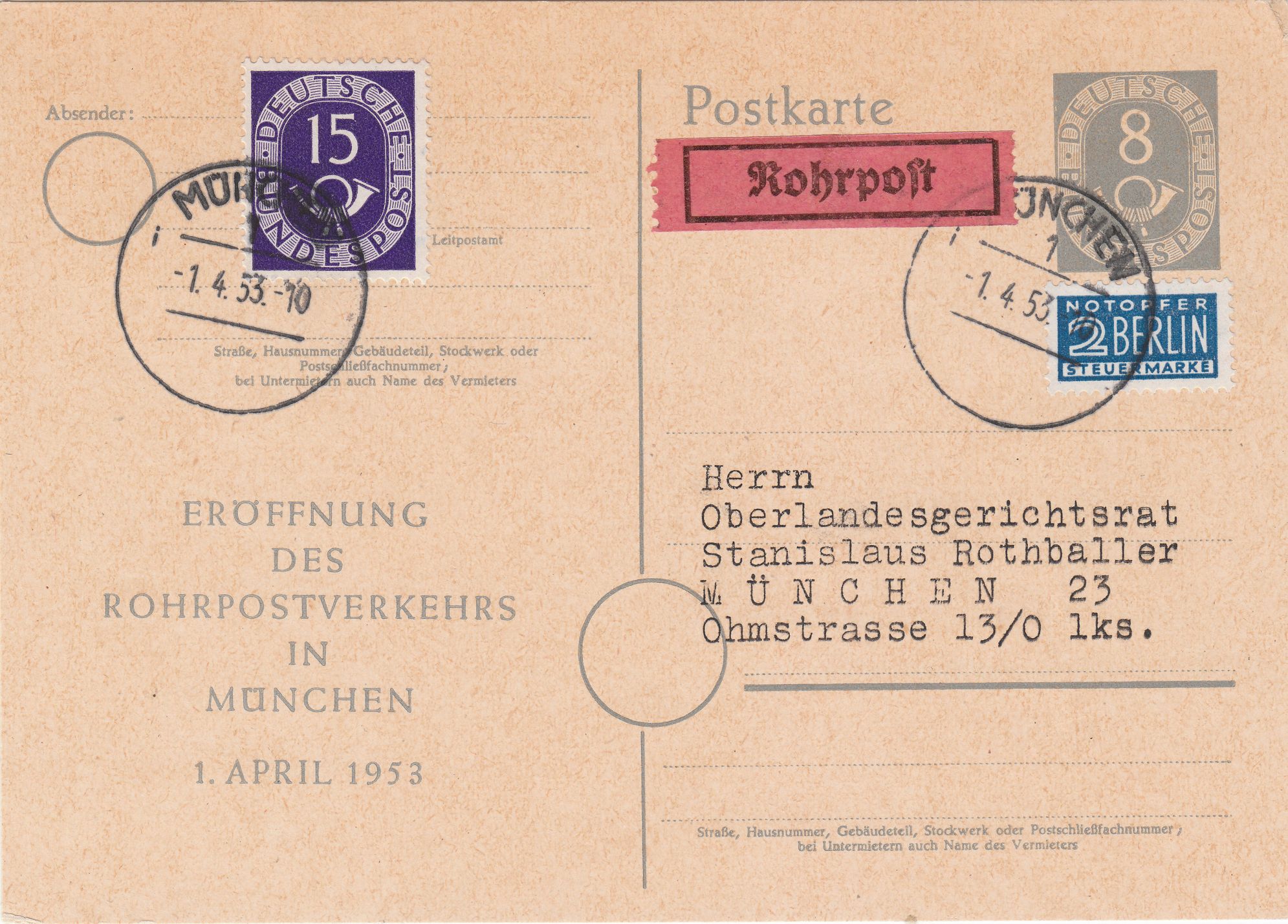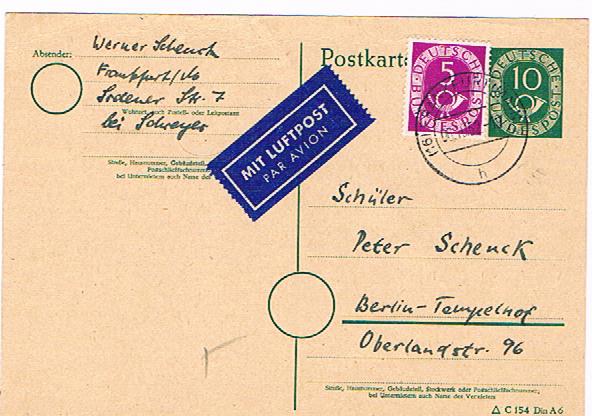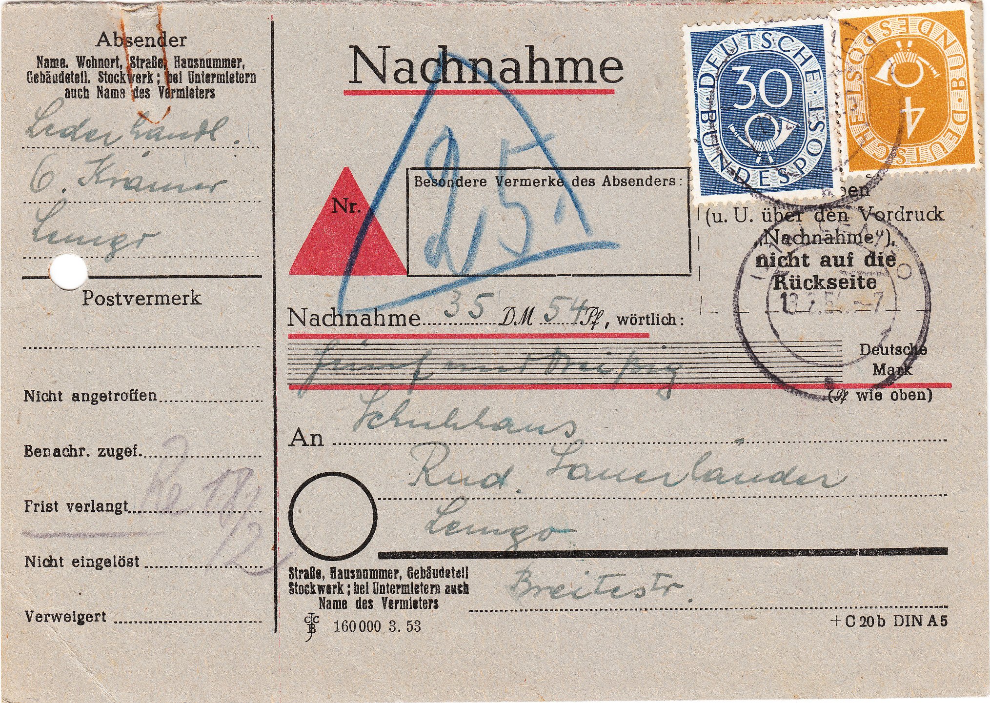 Postgeschichtlich interessant an diesem Beleg ist, dass der Dreieckstempel, der den Ablauf der einwöchigen Lagerzeit anzeigt, in diesem Falle der Dreieckstempel mit der "25", wohl gerade nicht zur Verfügung stand, weshalb ein entsprechender handschriftlicher Vermerk in Blaustift auf dem Beleg angebracht wurde!
