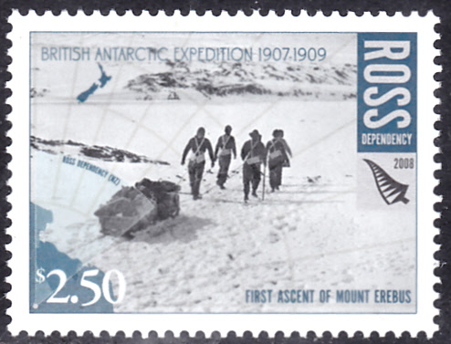 Die letzte Marke dieser Serie (MiNr 113) zeigt den ersten Anstieg zum Mount Erebus (3784 m).