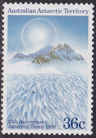 Der 36 Cent-Wert (MiNr 77) aus der am 11. März 1987 erschienenen Freimarkenserie "Landschaften" zeigt im Motiv einen Frühwinterabend bei der Casey-Station.