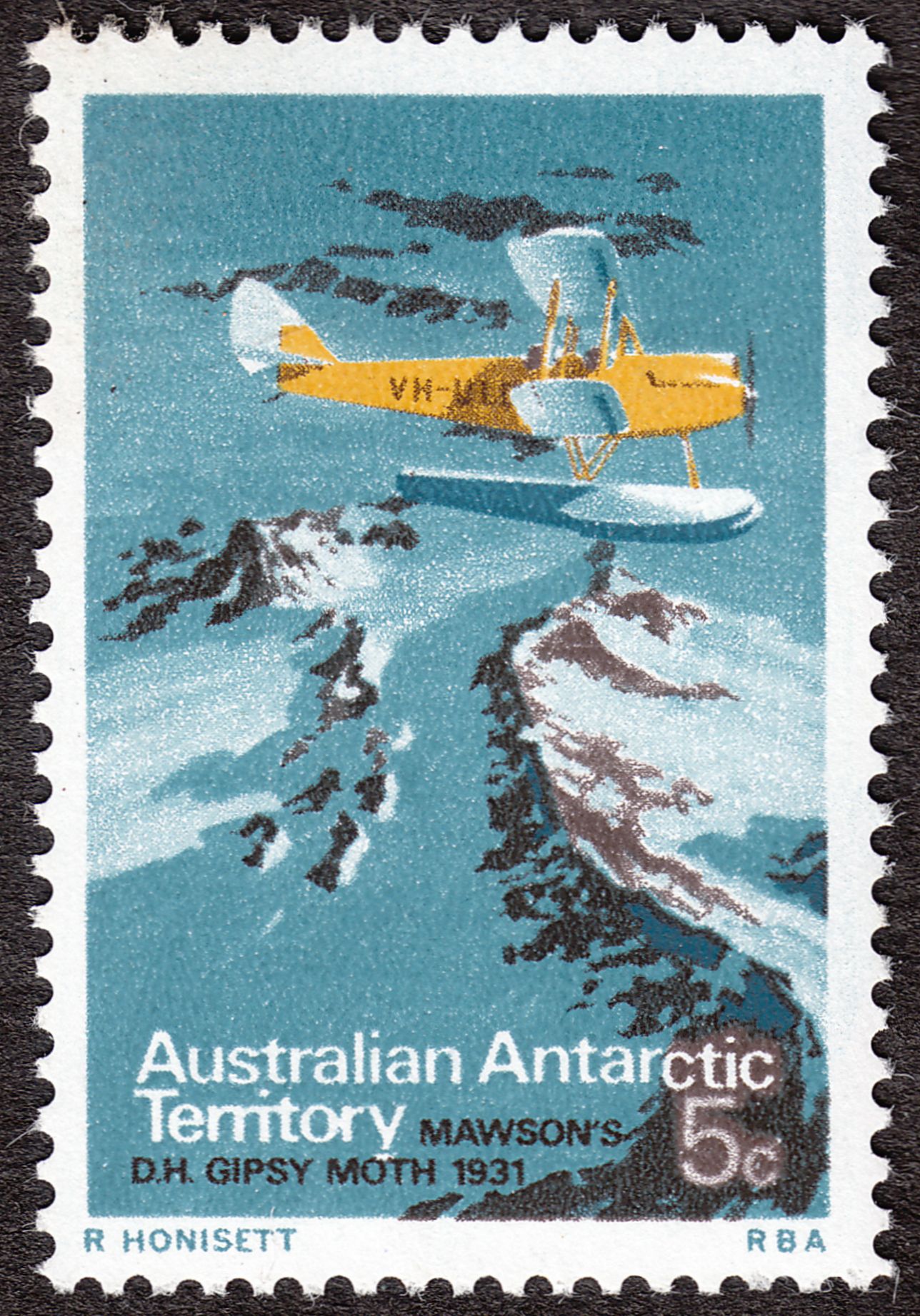 Diese Marke zu 5 Cents zeigt eine De Havilland DH60G als Maschine von Sir Douglas Mawson "MAWSON'S D.H. GIPSY MOTH 1931" mit der Kennung "VH-ULD":
