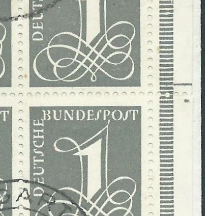 Am senkrechten Rand gibt es bei einigen Teilauflagen Unterbrechungen der Strichelleiste. Diese Unterbrechungen können an verschiedenen Stellen auftreten, daher nehme ich grundsätzlich erst mal alles mit, was mir über den Weg läuft. "Aussondern" kann ich dann immer noch, falls ich mich da mal vertan habe und eine Variante schon in der Sammlung vorhanden ist. Ein Beispiel hier im Bild: