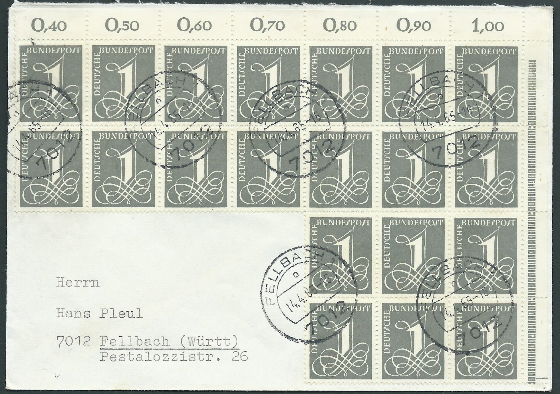 Beim nächsten Beleg würde als erstes der Oberrand von 3 Marken mit den Reihenwertzählern 0,40, 0,50 und 0,60 ins Auge fallen. Aber auch hier ist wieder der Anlagestrich am rechten Rand vorhanden!