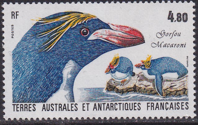 Die dritte Marke (MiNr 222) aus der Serie "Tiere der Antarktis" bildet Felsenpinguine ab.