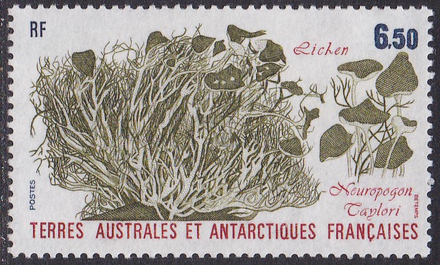 Die zweite Marke (MiNr 224) aus der Serie "Pflanzen der Antarktis" der Französischen Gebieten der Antarktis bildet eine Flechte (Neuropogon taylori) ab.