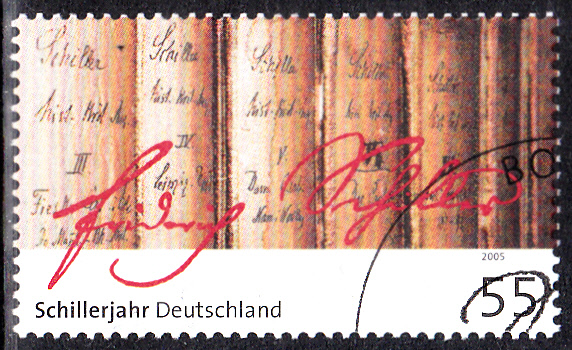 Zum "Schillerjahr 2005", sprich zum 200. Todestag von Friedrich von Schiller, erschien diese Sondermarke (MiNr 2461) bei der Deutschen Post. Im Markenbild zu sehen ist eine frühe Gesamtausgabe der Werke von Schiller und seine Unterschrift.