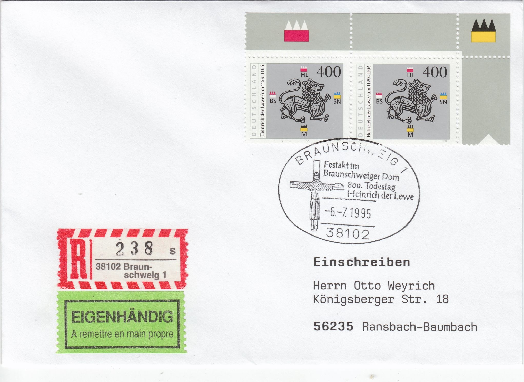Paar vom Eckrand 2 des Zehnerbogens, am 06.07.1995 = Erstausgabetag in Braunschweig gestempelt, portorichtig auf Standardbrief (100 Pf), per Einschreiben (350 Pf), eigenhändig (350 Pf).
