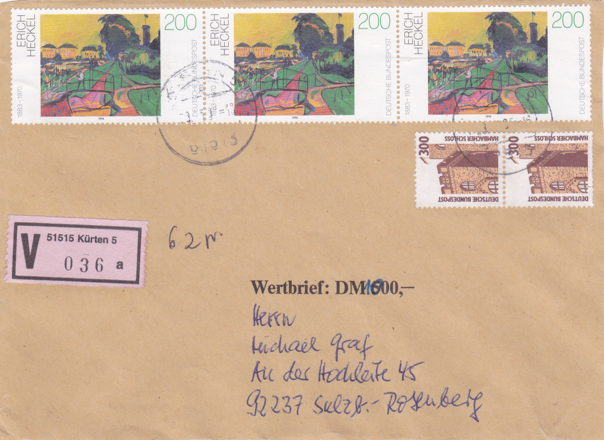Dieser Großbrief mit Wertangabe 1000,-- DM mit 62 Gramm schwer von Kürten nach Sulzbach-Rosenberg aus dem Jahre 1995 (Datum leider nicht lesbar) wurde frankiert mit drei Marken zu 200Pf aus der Serie "Deutsche Malerei des 20. Jahrhunderts" mit dem Motiv "Landschaft bei Dresden" von Erich Heckel (MiNr 1749) und zwei Marken aus der Dauerserie "Sehenswürdigkeiten" zu 300Pf (MiNr 1348). Das Porto setzt sich wie folgt zusammen: Großbrief 300Pf (1.4.1993 bis 31.12.2001), Wertangabe 100DM 900Pf (1.9.194 bis 31.8.1997), zusammen also 1200Pf.