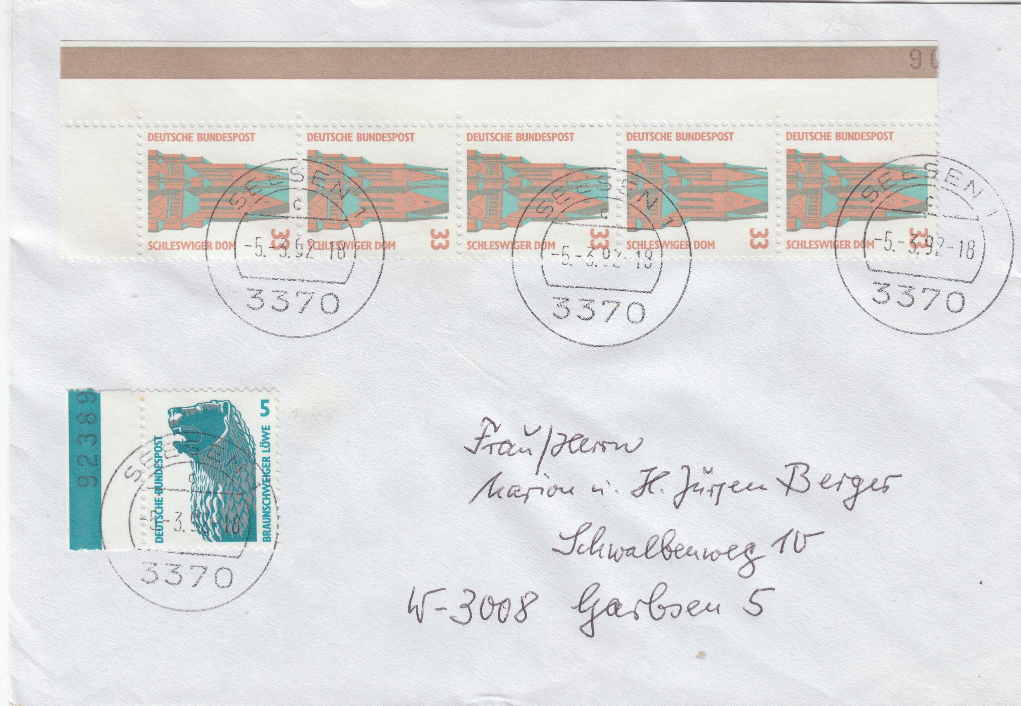 MiF 5 Pf und 5x33 Pf am 21.02.1992 portorichtig auf Brief von 21 bis 50 g