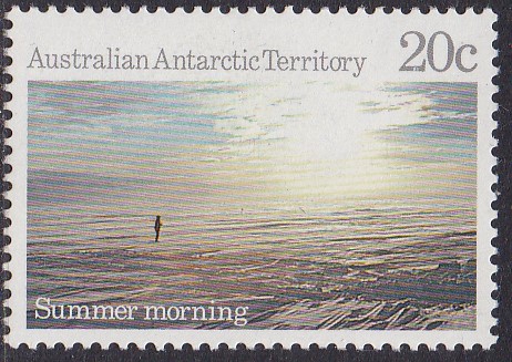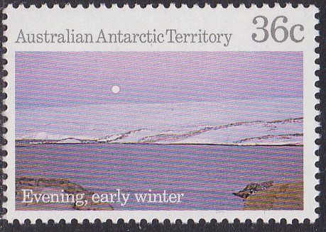 Der 10 Cent-Wert (MiNr 75) aus der am 11. März 1987 erschienenen Freimarkenserie "Landschaften" zeigt im Motiv einen Spätsommerabend in Mac-Robertson-Land.