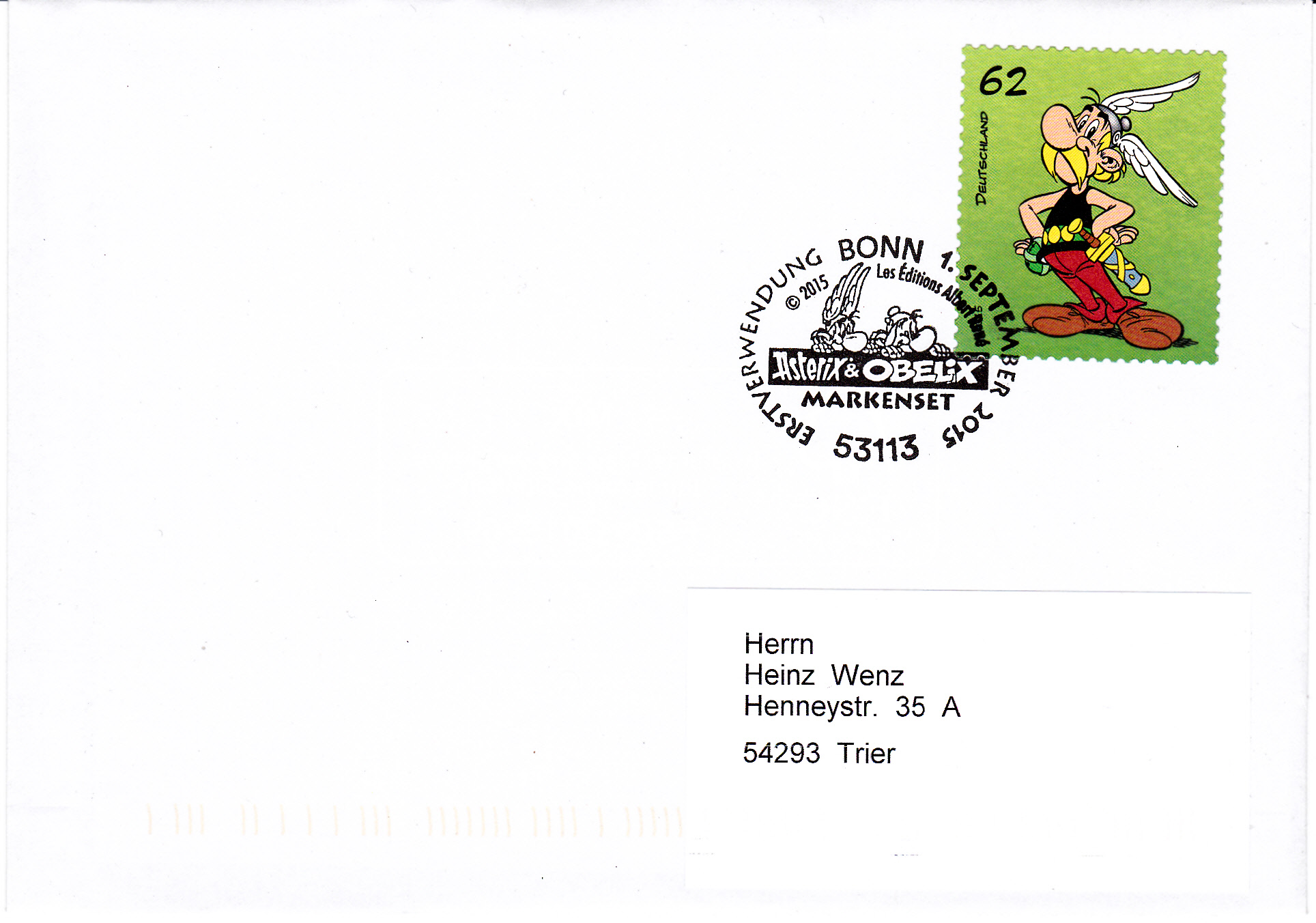 Für die selbstklebenden Marken aus dem sogenannten "Markenset" wurde ein eigener "Ersttagstempel" ein sogenannter "Erstverwendungsstempel" Bonn zur Abstempelung am 1.9.2015 benutzt. Hier sind Asterix und Obelix gemeinsam im Stempelbild. Hier ein Brief mit der Asterix-Marke.