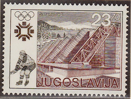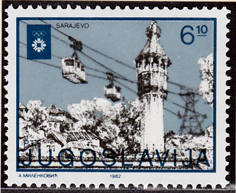 Die dritten Marke (MiNr 2009) der Serie gewährt einen Einblick in die Kombiniert Bob- und Rodelbahn auf dem Berg Trebević.