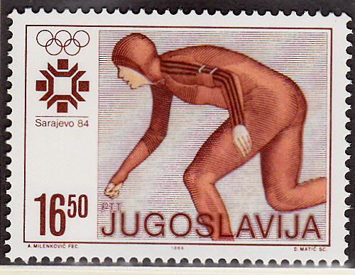 Auf einer weiteren Marke aus Jugoslawien (MiNr 2029) zu den Olympischen Winterspielen 1984 wird ebenfalls ein Eisschnellläufer gezeigt.