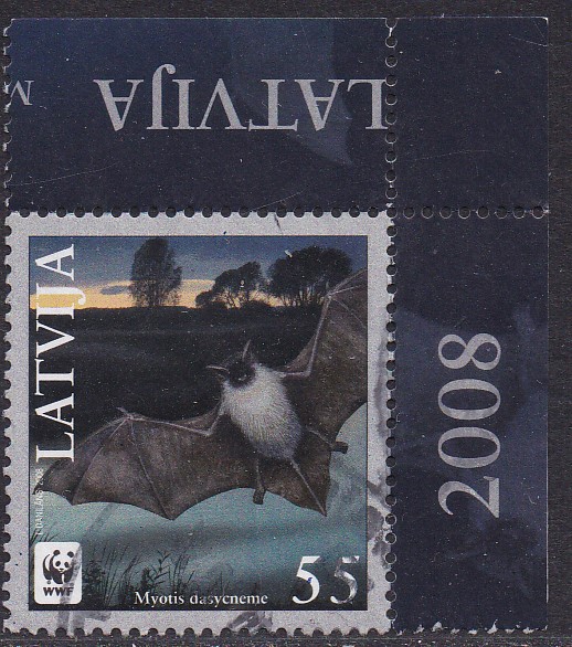 Diese Marke aus Lettland (MiNr 730), hier ein Eckrandstück, zeigt eine Teichfledermaus.