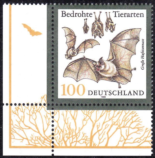 Bei der Deutschen Post ist eine Marke (MiNr 2086) mit der Abbildung von mehreren Großen Hufeisennasen (Rhinolophus ferrumequinum) erschienen. hier ein Eckrandstück der Marke: