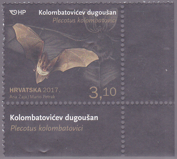 In der gleichen Markenserie aus Kroatien gibt es auch diese Marke (MiNr 1273) mit einem Balkan-Langohr (Plecotus kolombatovici). Hier zeige ich ebenfalls ein Eckrandstück der Marke. Auf dem unteren Bogenrand ist auch hier der Name der Fledermaus zu lesen.