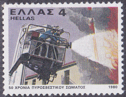 Zum Jubiläum "50 Jahre Feuerwehrcorps" ist in Griechenland diese Marke (MiNr 1415) mit Feuerwehrleuten bei Löscharbeit erschienen.