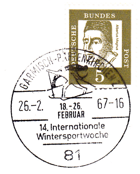 Sonderstempel vom 26.2.1967 aus Garmisch-Partenkirchen zur 14. Internationalen Wintersportwoche. Im Stempel werden ein stilisierter Skilangläufer und ein Skispringer abgebildet.