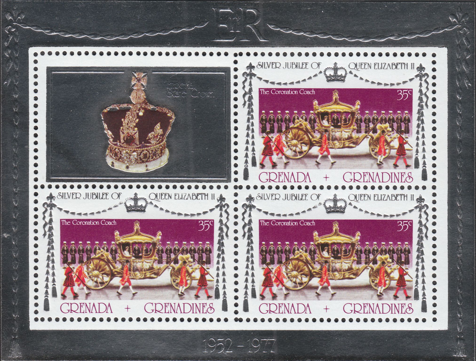 Zur Dokumentation von 25 Jahren Regentschaft von Königin Elisabeth II. erschien am 08.02.1977 dieses Postwertzeichen, MiNr. 217 C, das die Königin in der goldenen Kutsche zeigt, hier als Kleinbogen zu 3 Marken und einem Zierfeld: