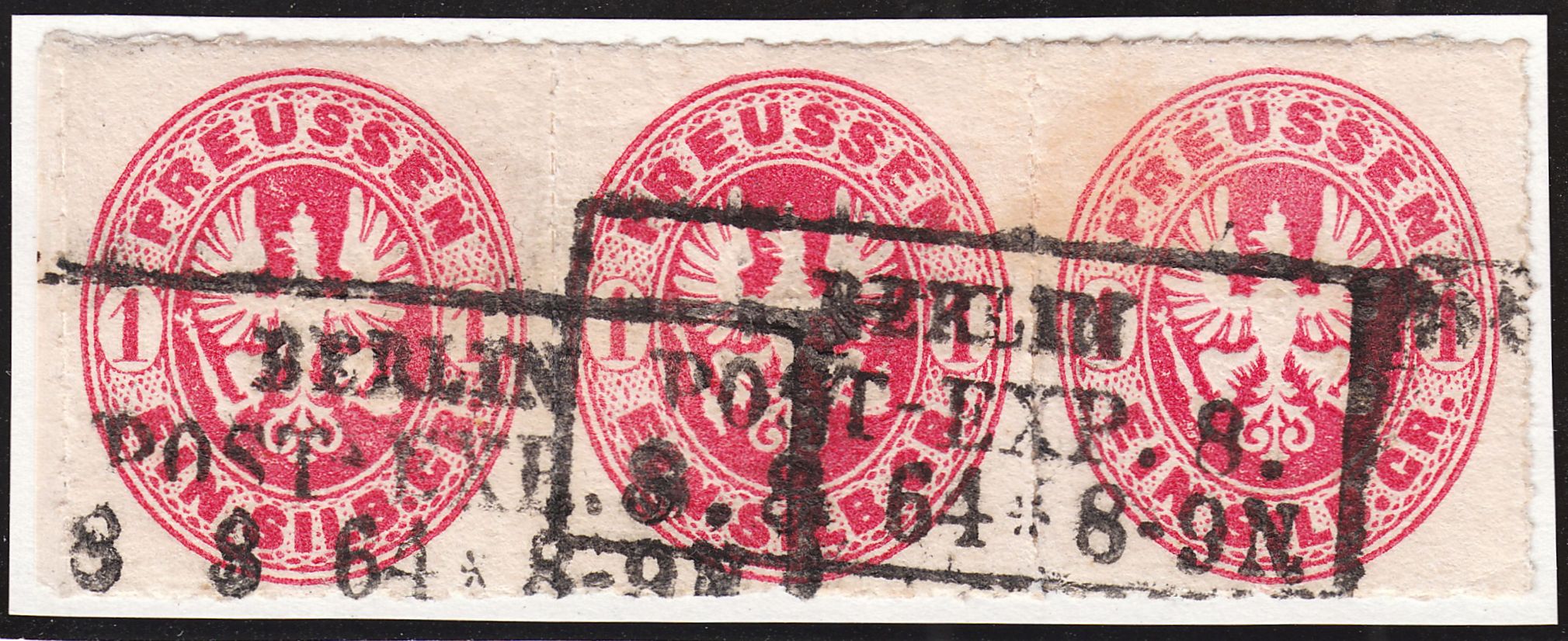 Waagerechter Dreierstreifen der MiNr. 16 mit Rahmenstempel "BERLIN POST-EXP. 8." vom 08.08.1864: