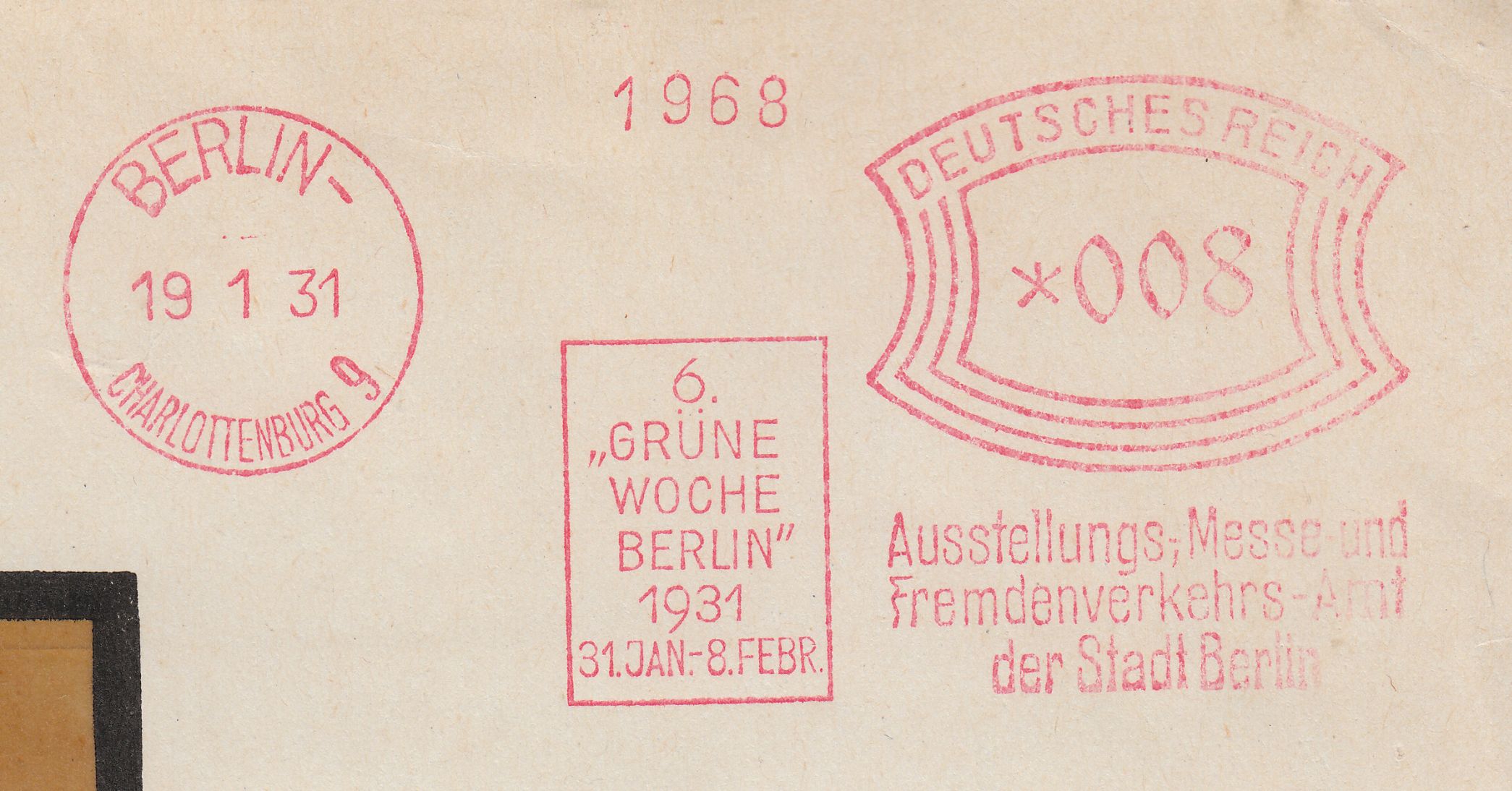 Hier ein Absenderfreistempel vom 19.01.1931 zur 6. "GRÜNE WOCHE BERLIN" 1931, die vom 31.01.1931 bis zum 08.02.1931 stattfand: