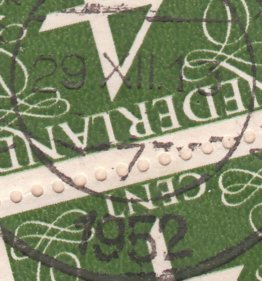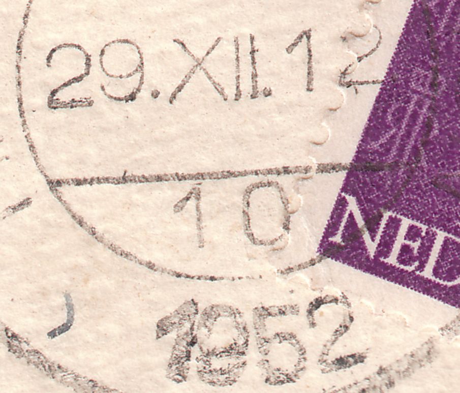 Die Frankatur wurde um die beiden Postwertzeichen der Wertstufe 4 Cent unten links ergänzt und die zusätzliche Frankatur wurde am 29.12.1952 um 13 Uhr gestempelt: