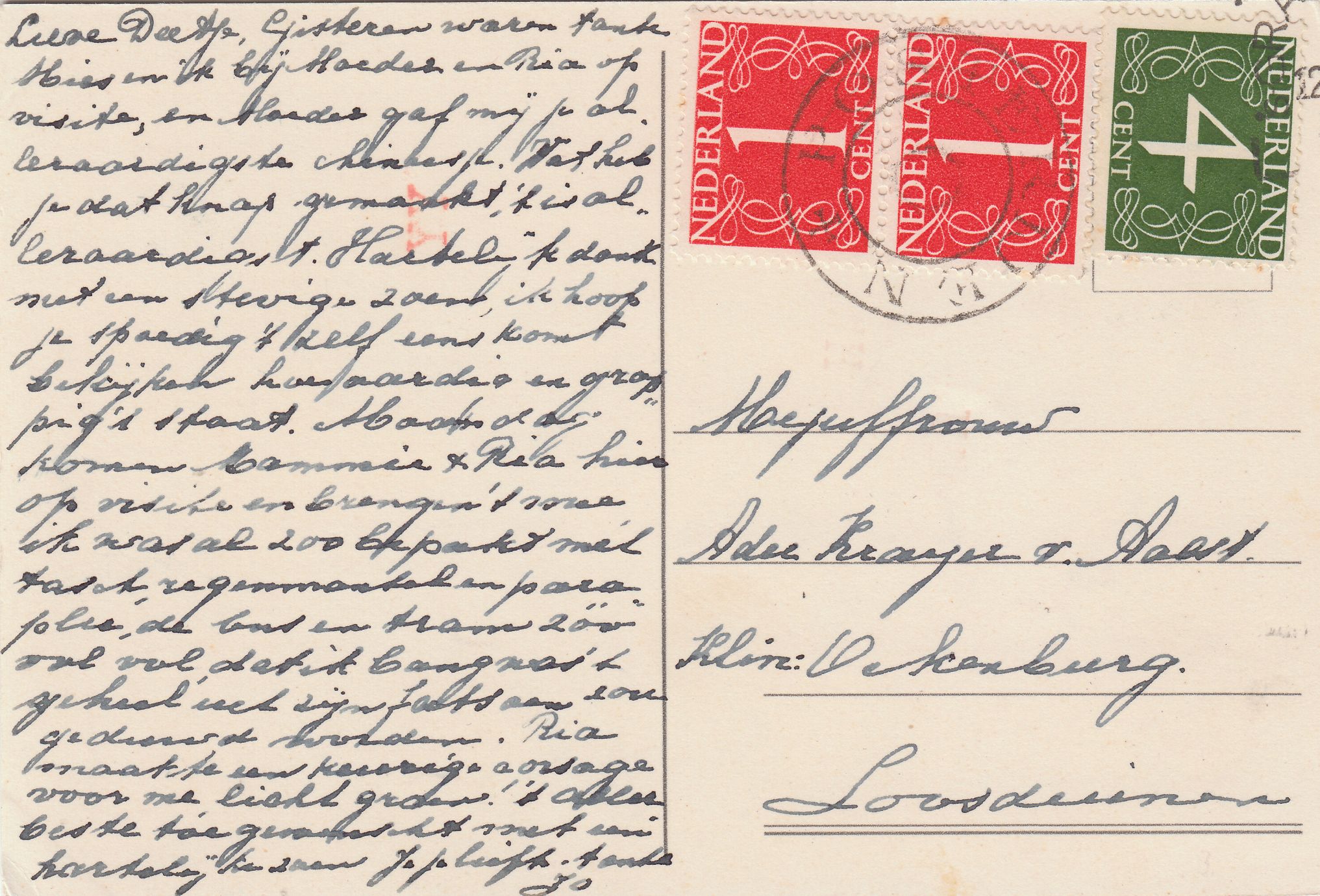 Das Besondere an diesem am 29.12.1952 um 12 Uhr in Haarlem aufgegebenen, nach Canada adressierten Beleg ist, dass er, weil nicht ausreichend frankiert, mit einem Klebezettel versehen wurde, damit der Absender die Freimachung ergänzen sollte: