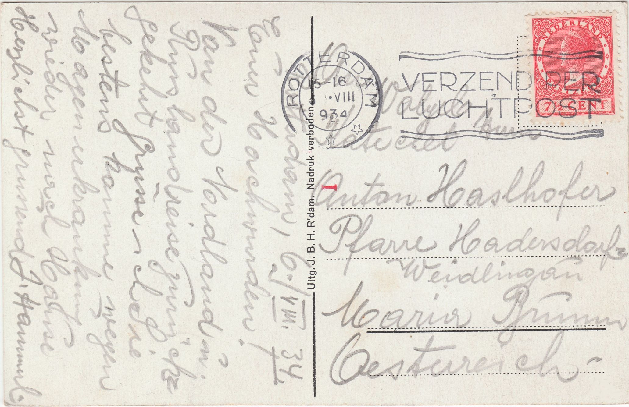 Diese nach Österreich adressierte Postkarte wurde am 06.08.1934 in Rotterdam aufgegeben und durchlief zur Ausgangssortierung die dortige TRANSORMA, worauf ein Operatorstempel "I" hinweist: