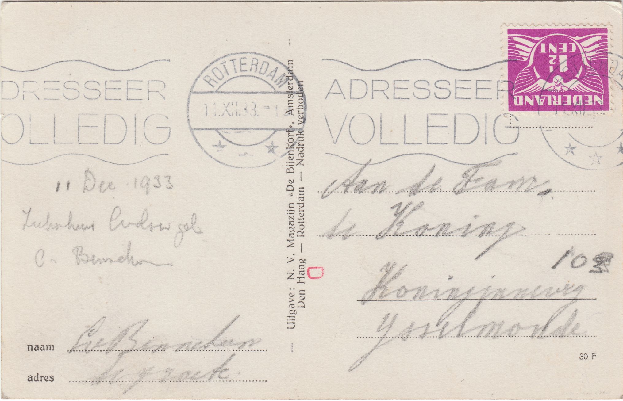 Diese nach Ijsselmonde adressierte Postkarte wurde am 11.12.1933 in Rotterdam aufgegeben und durchlief zur Ausgangssortierung die dortige TRANSORMA, worauf ein Operatorstempel "D" hinweist: