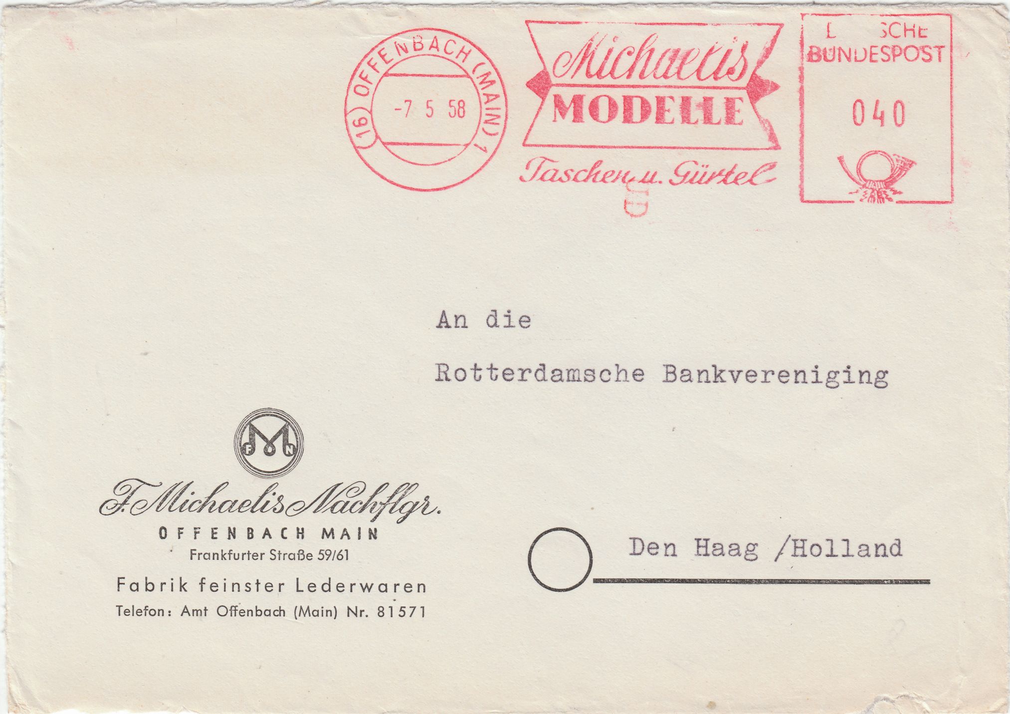 Dieser nach Den Haag adressierte, am 07.05.1958 in Offenbach aufgebene Brief durchlief in Den Haag die Eingangssortierung per TRANSORMA, worauf ein Operatorstempel "UD" hinweist: